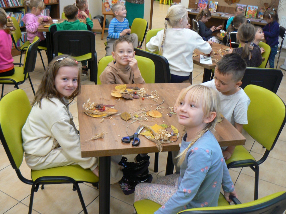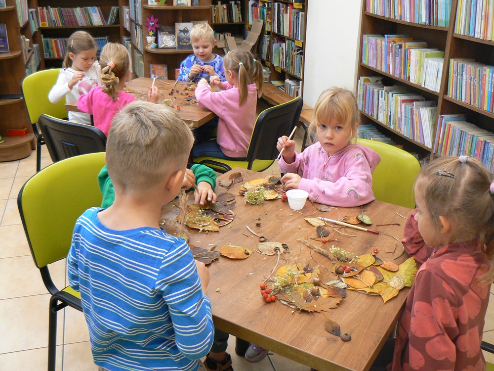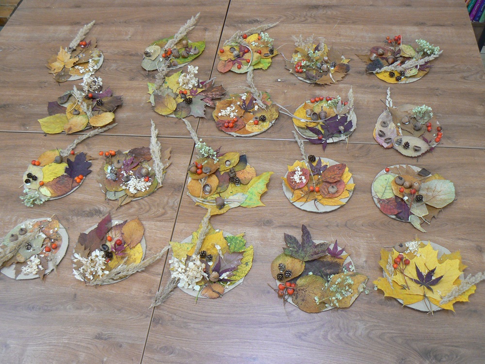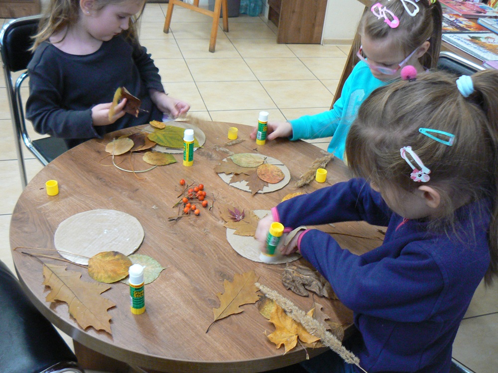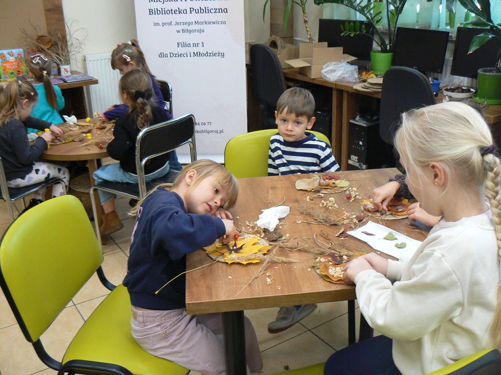 Przedszkolaki ze Szkoły Podstawowej Nr 1 w Biłgoraju uczestniczyły w warsztatach plastycznych "Dary jesieni". Dzieci robiąc kompozycje z liści drzew, malutkich szyszek, żołędzi, jarzębiny uczyły się łączenia różnych form i kolorów. Delikatne suszone liście wymagały od dzieci uwagi i precyzji. Obcowanie z bogactwem naszej natury okazało się niezwykłą kreatywną i edukacyjną zabawą.